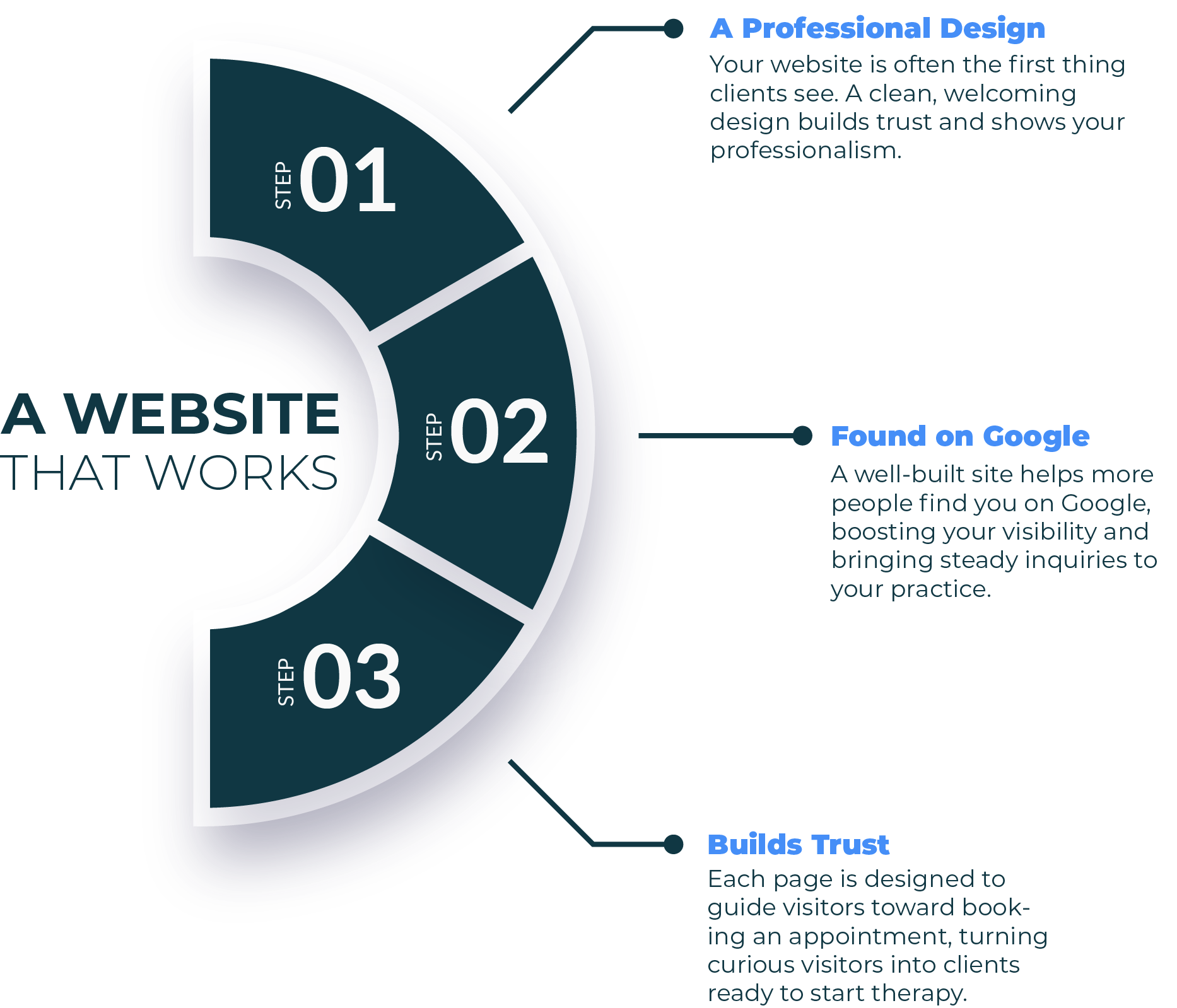 We build websites that work, only for therapists who are serious about growing their practice. Optimized for SEO, optimized for conversion. All you do is fill out the intake form - we take it from there