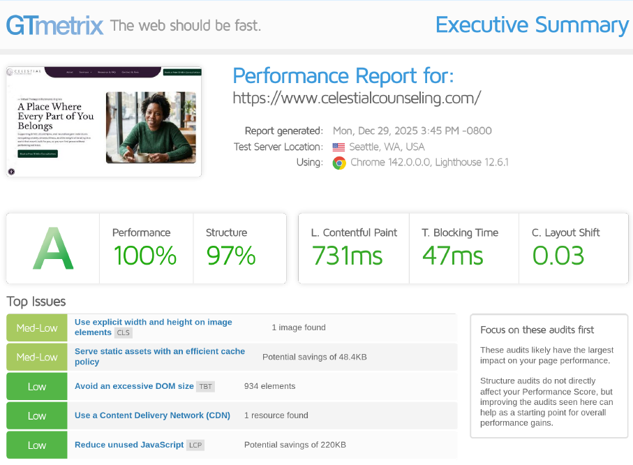 Therapy websites are held to stricter criteria because they deal with health and wellbeing. We build to meet those standards from day one. Better rankings, more credibility.